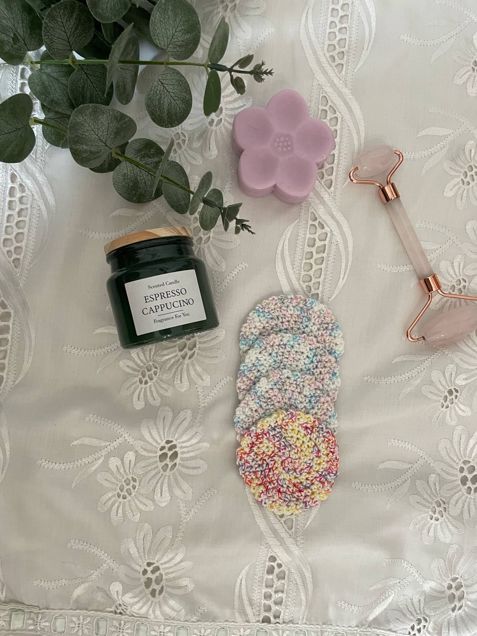 Horgolt arctisztító korong, 5-6 cm átmérőjű négy darabos szett. 100% pamutfonalból készült. Kíméletesen tisztítja a bőrt, pihe puha, alkalmas smink eltávolítására, tonik felvitelére, vagy arctisztitásra. Használat után szappanos vízzel át öblítendő. Mosógépben, mosózsák használatával negyvenfokon mosható, formára igazítva száritandó.