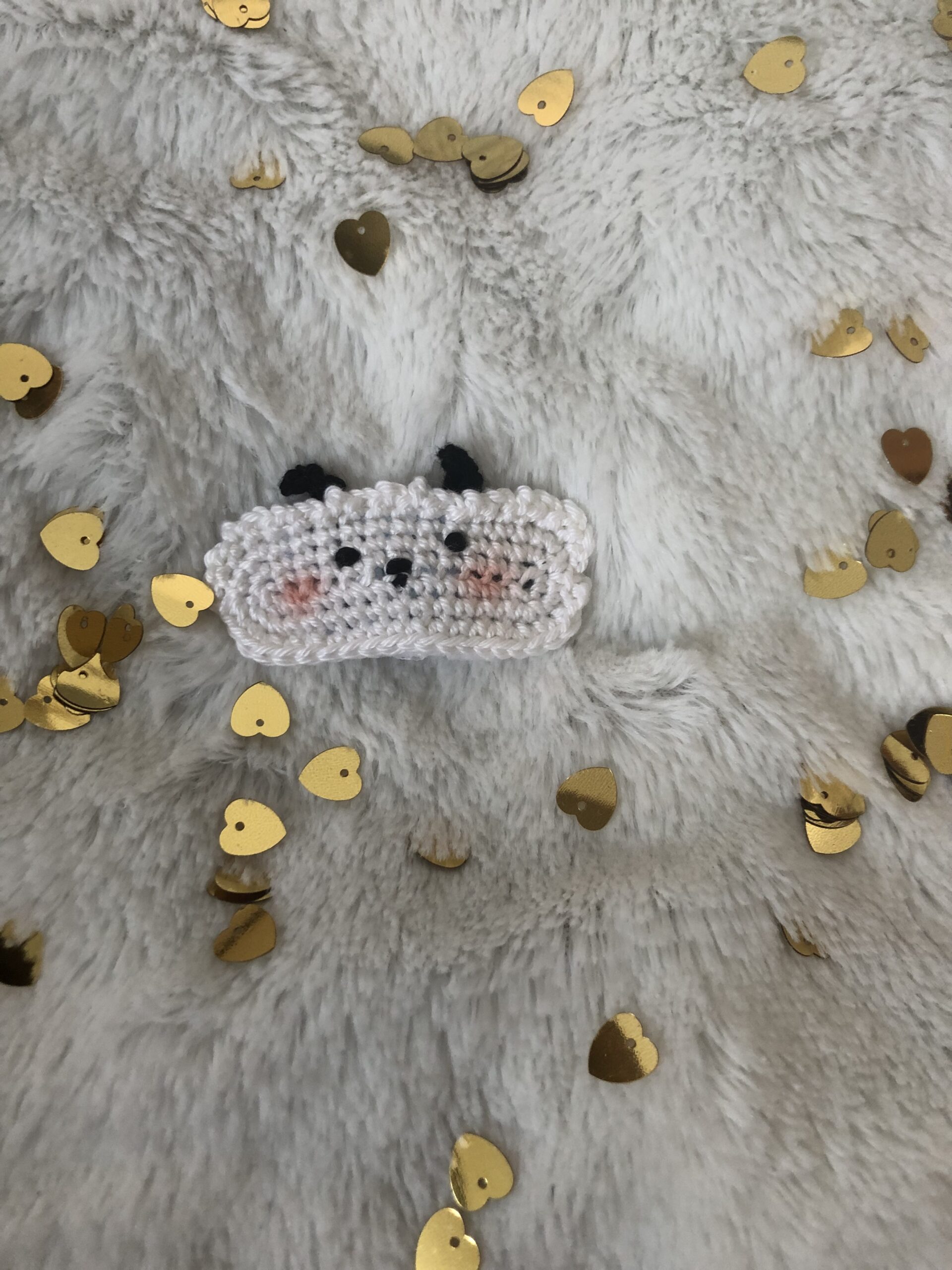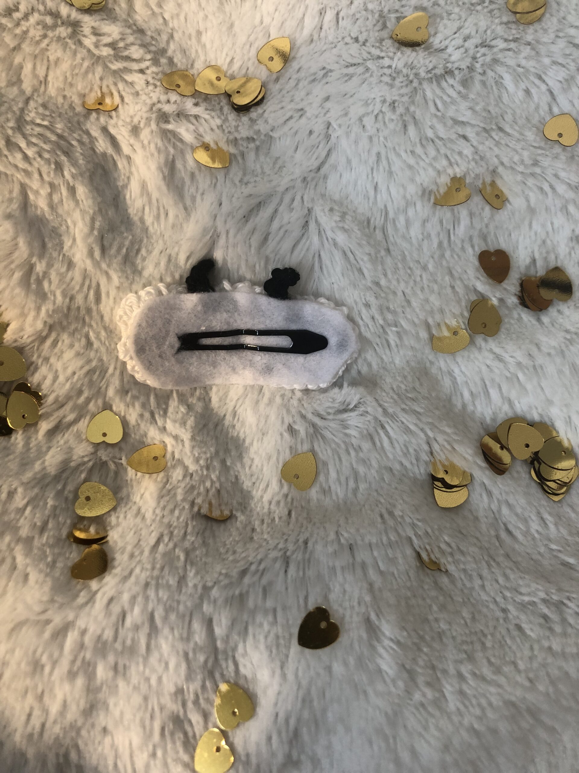 Horgolt hajcsat, báránykás, körülbelül 6-6,5 cm hosszú és 3-4 cm széles. 100 % pamutfonalból készült. Fém csit-csat az alapja, melyre egy filc lap kerül, majd ragasztással (melegragasztó) illeszkedik rá a horgolt díszítés. Apró, de különleges, egyedi ajándék lehet.