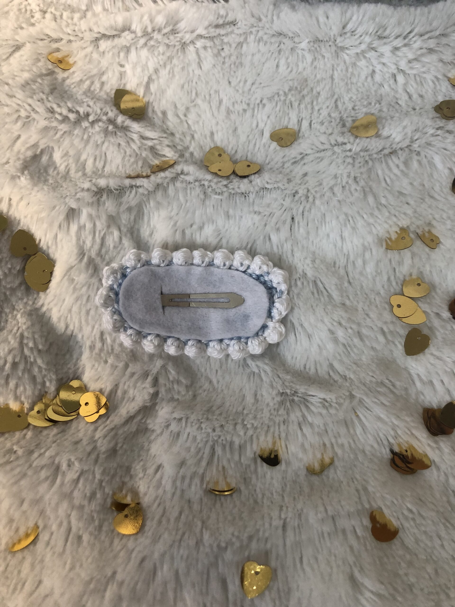 Horgolt hajcsat, körülbelül 6-6,5 cm hosszú és 3-4 cm széles. 100 % pamutfonalból készült. Fém csit-csat az alapja, melyre egy filc lap kerül, majd ragasztással (melegragasztó) illeszkedik rá a horgolt díszítés. Apró, de különleges, egyedi ajándék lehet.