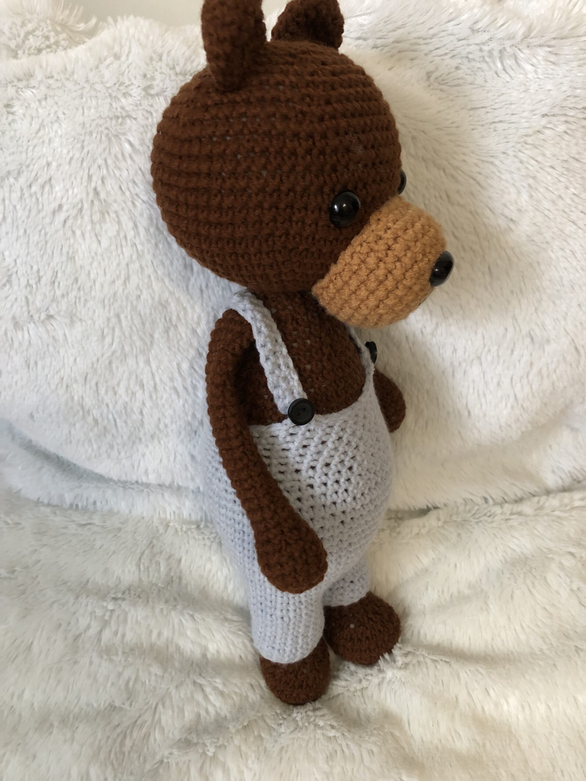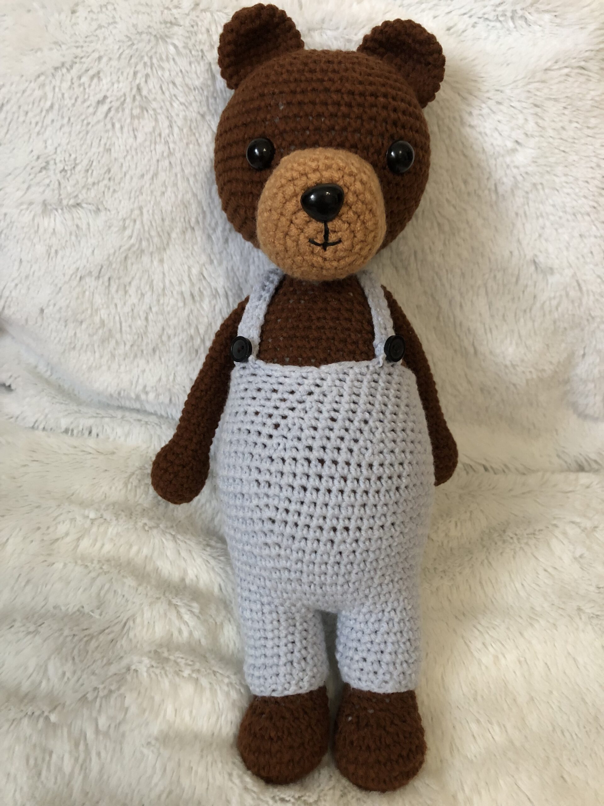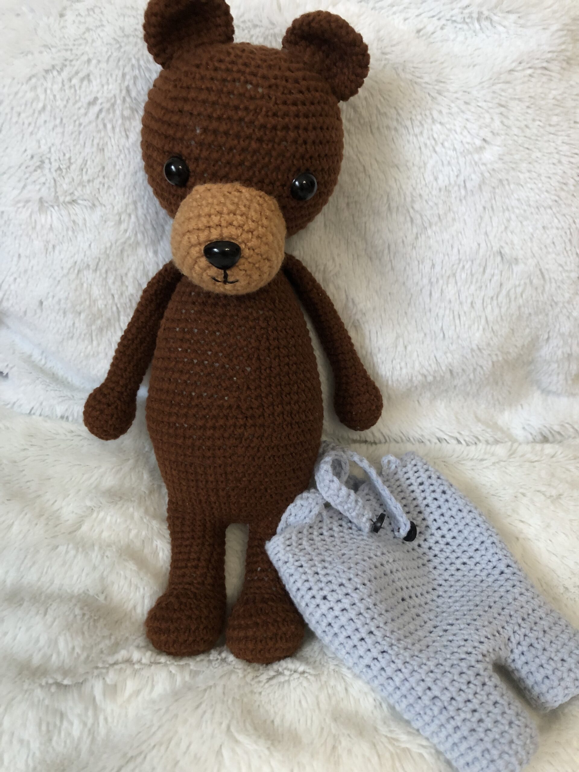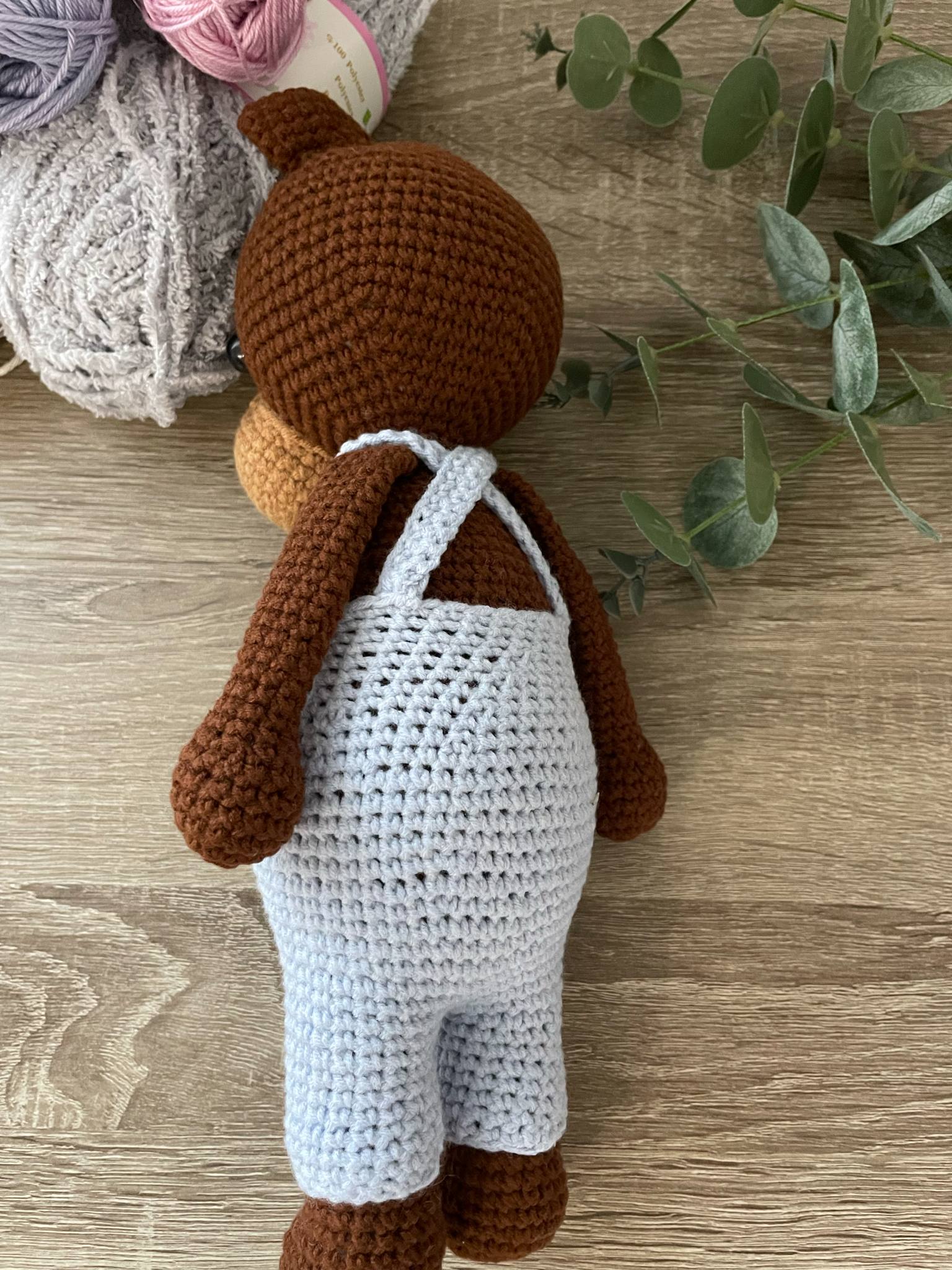 A maci 30 cm hosszú a fülekkel együtt. Töltete, szilikonizált poliészter golyó. szemei biztonsági bab szemek (ezért három éves kor alatt nem ajánlott). Yarnart Jeans fonalból készült, mely 55%pamut, 45% poliakril. A maci pocakja pihe puha, nadrágja levehető. Nagyon várja gondos kis gazdáját.