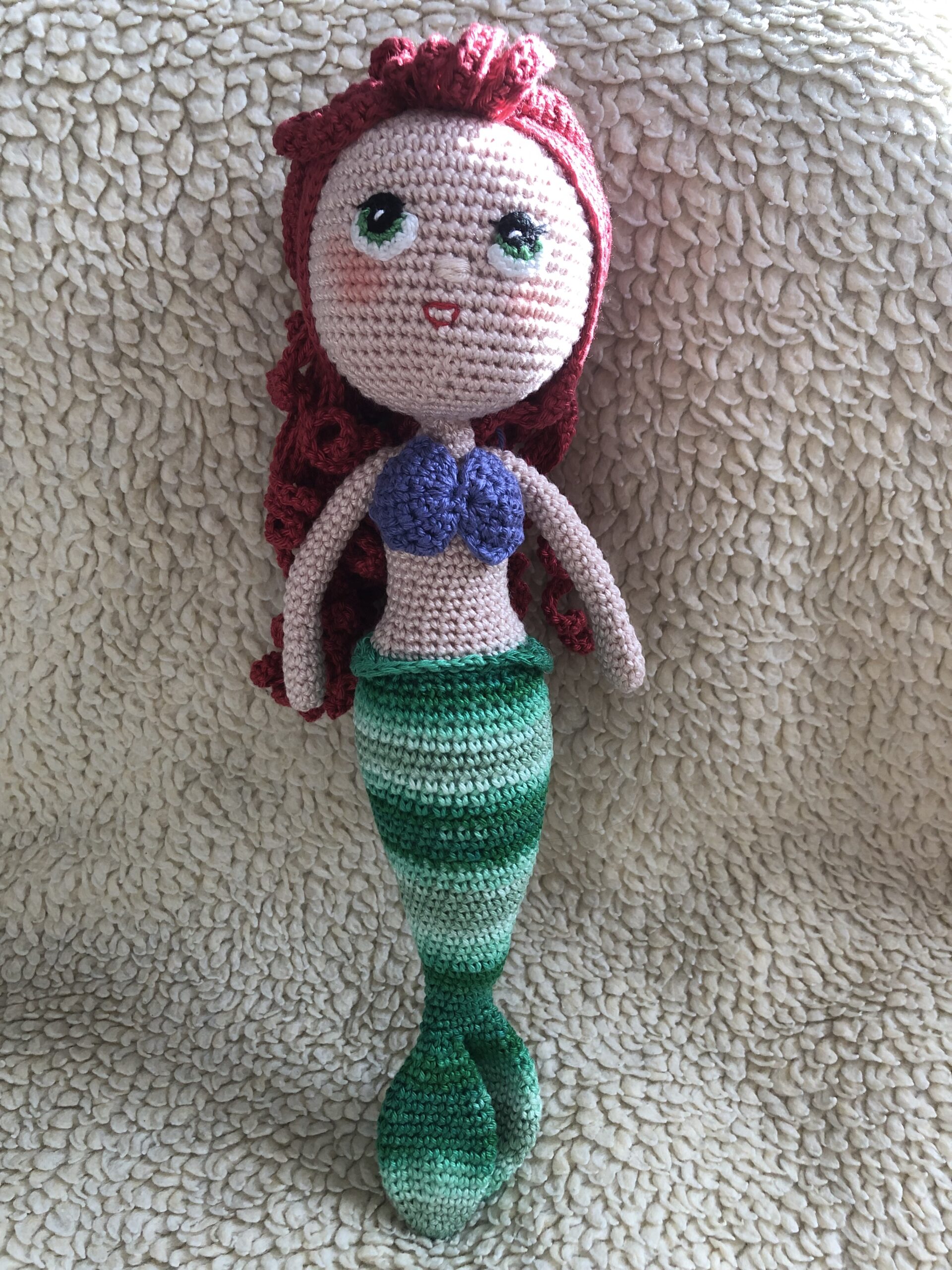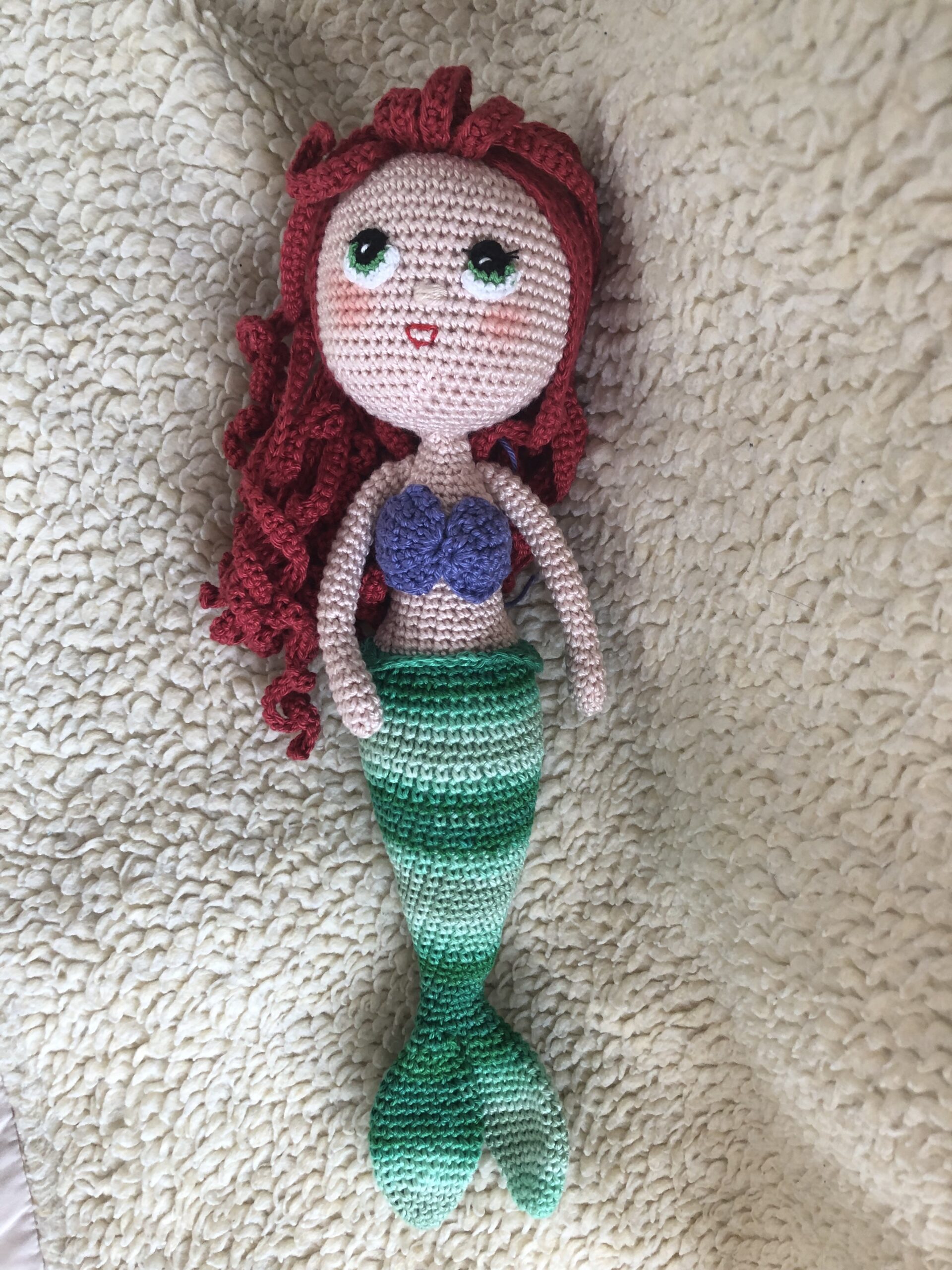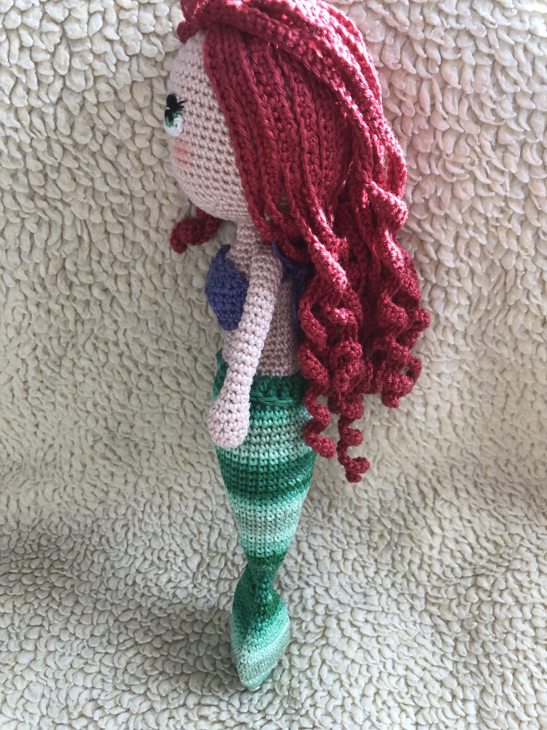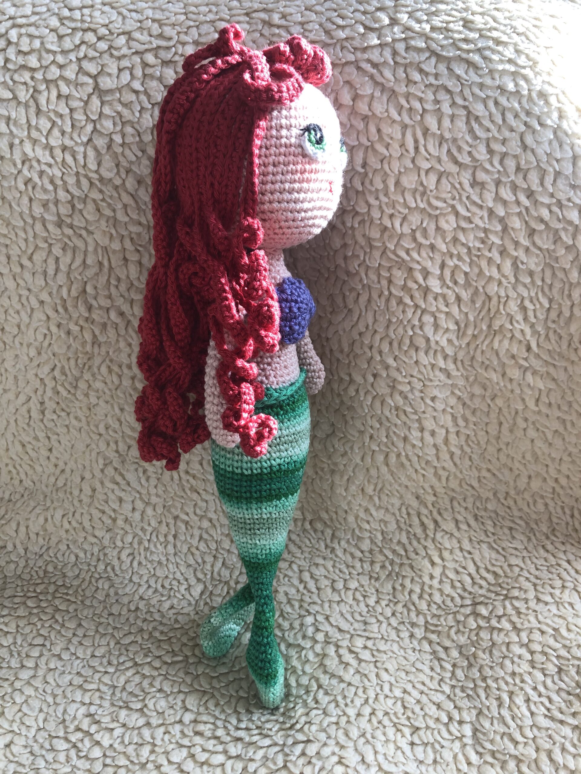 A sellőbaba 32cm, 100% minőségi mercerizált pamutfonalból készült. Tömőanyag szilikonizált poliészter golyó. A baba testében és fejében szigeltelt MCU drót (végei visszahajtva, leragasztva) van (ez tartja a fejet), illetve a karokban is. A baba szemei hímzőfonalból készültek. A baba kézzel mosható, maximum 40 fokon.