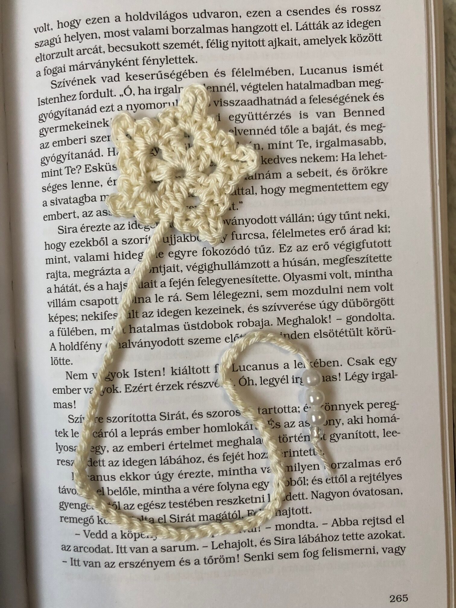 Horgolt könyvjelző, teljes hossza körülbelül 24-25 cm. A hópihe átmérője 3 cm. 100% mercerizált pamutfonalból készült. A szár végét gyöngyök díszítik. Örök emlék lehet ez a kedves ajándék, akár pedagógusok részére is.
