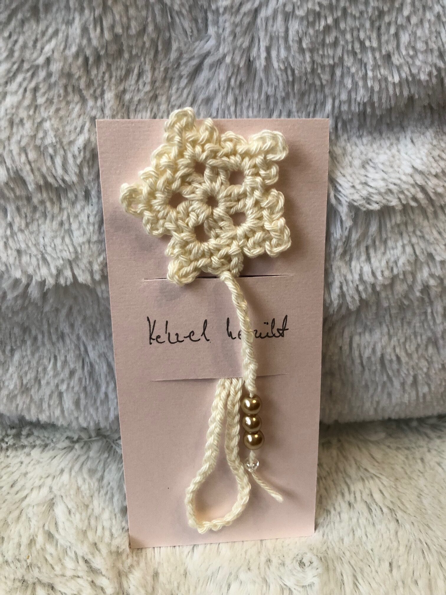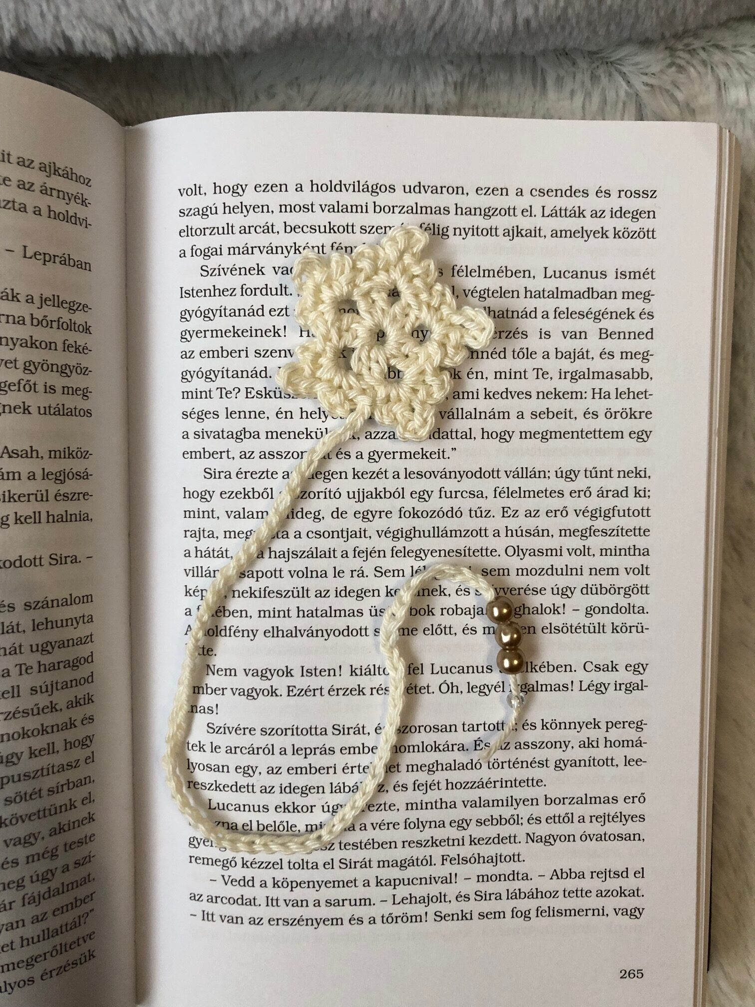 Horgolt könyvjelző, teljes hossza körülbelül 24-25 cm. A hópihe átmérője 3 cm. 100% mercerizált pamutfonalból készült. A szár végét gyöngyök díszítik. Örök emlék lehet ez a kedves ajándék, akár pedagógusok részére is.